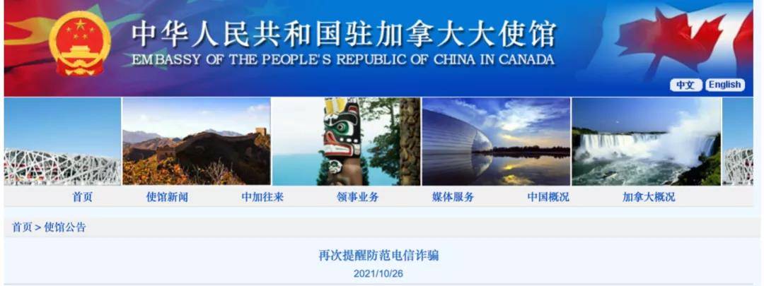 10月26日,中国驻加拿大大使馆发布重要安全公告,提醒在加留学生注意防范电信诈骗。